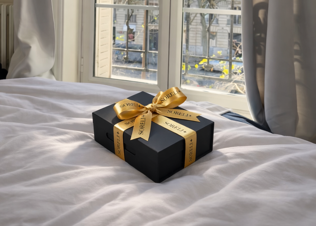Chaque bijou Soreli est livré dans un écrin élégant, glissé dans sa boîte cadeau, avec une carte prête à offrir.